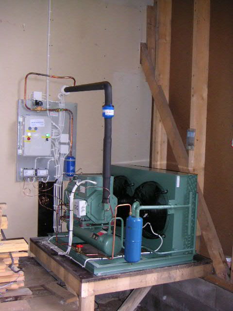 Kylmävaraston (18 kW) ja pakkaamon (12 kW) kylmäkoneistot.